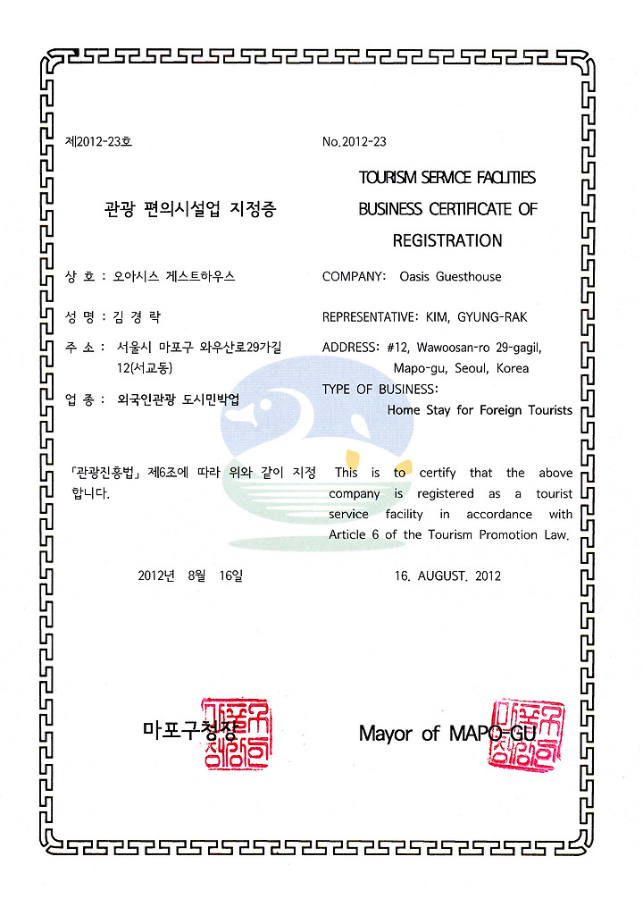 – 관광사업등록신청서-사업계획서1부-신청인의 성명, 주민등록번호를 기재한 신청서-시설배치도 또는 사진 및 평면도-부동산의 소유권 또는 사용권증명서류·신청인 본인 소유의 경우: 건물/토지등기부등본·임대차계약에 의한 거주의 경우: 임대차계약서 사본-사업자 본인이 방문신청을 할 수 없는 경우: 위임장 지정관청: 소재지 관할 구청 수수료 및 처리기간: 14일 (구청별 기간 차이가 있음/등록 후 면허세 납부) – 신청프로세스 신청⇒접수⇒심의(서류심사, 현장등록증