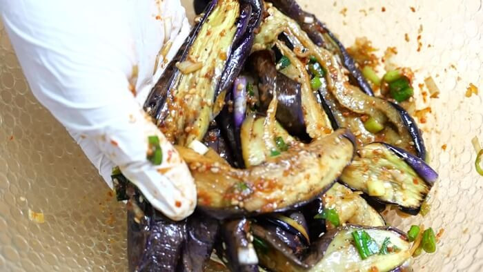 한기를 식힌 후 손으로 뜯어주세요.대파 1뿌리, 다진마늘 1스푼, 설탕 1스푼, 간장 4스푼, 고춧가루 1스푼, 참기름 1스푼을 넣고 양념을 만드세요.대파 1뿌리, 다진마늘 1스푼, 설탕 1스푼, 간장 4스푼, 고춧가루 1스푼, 참기름 1스푼을 넣고 양념을 만드세요.주물러 무쳐주세요~예쁘게 담으면 완성~간단하고 맛있는 쫀득한 가지무침~!! 한번 해보세요^^#제철요리 #가지 #가지반찬 #가지무침 #구이가지무침 #반찬 #간단한반찬 #혈관에좋은 #홈쿡 #가정식 #food #레시피