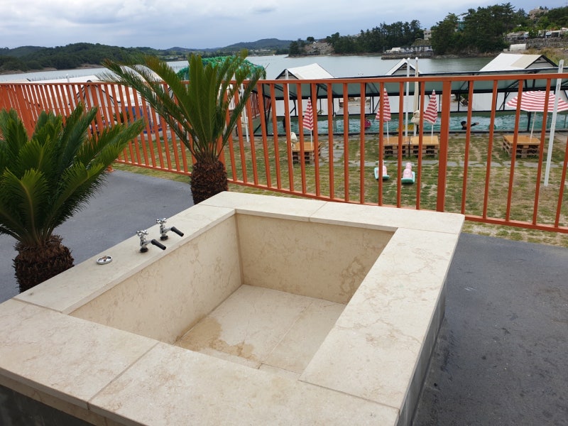 온수 스파가 가능한 깨끗한 욕조~수영장 이용이 어려운 아이들이나 수영장 이용이 부끄러운 어른들이 이용하면 좋겠다고 생각했습니다. 식사와 휴식을 취할 수 있는 테이블과 가족 수에 맞춰 준비된 의자까지…