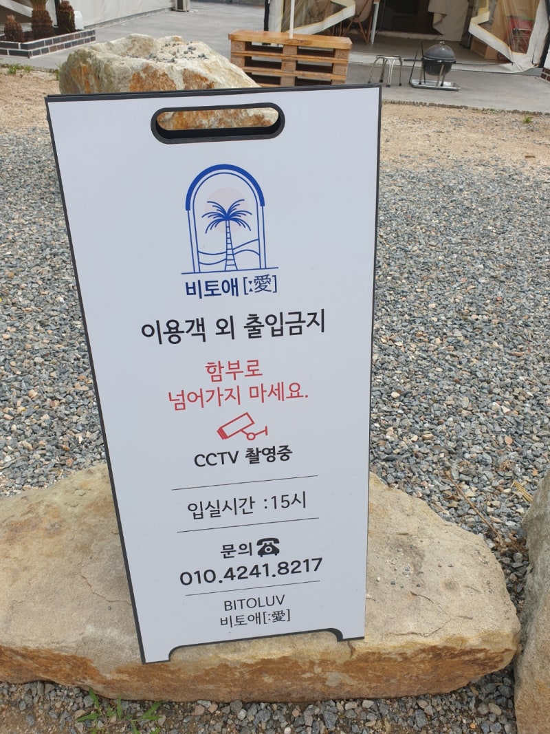 주차를 하고 관리동으로 이동하는데 비트어글램핑장 시즌2는 주차장이 조금~숨어서 더 좋았습니다. 주차장이 조금 깊숙한 곳에 있어서 바다뷰가 가려지지 않아요. 멋진 배경에서 사진을 찍었는데 뒷배경에 차가 나올뻔했다면(눈물) 조금 슬펐을거에요.