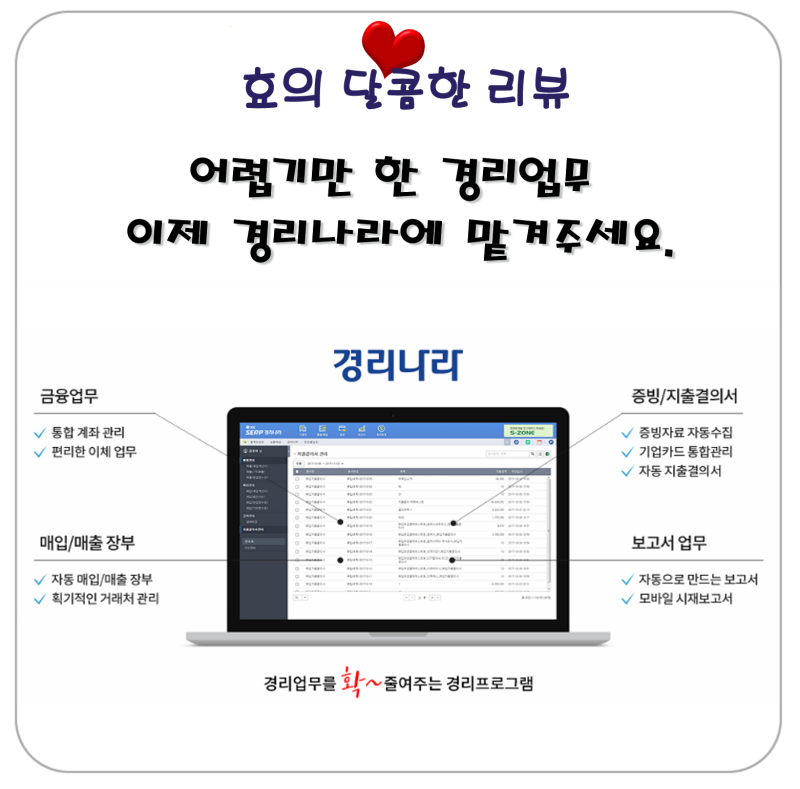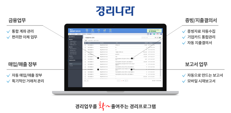 증빙/영수증 관련 업무를 90%, 거래처 관리 업무를 90%, 금융/지출 업무 80%, 보고서 업무를 100% 감소시키는 경리 프로그램이 되겠습니다.