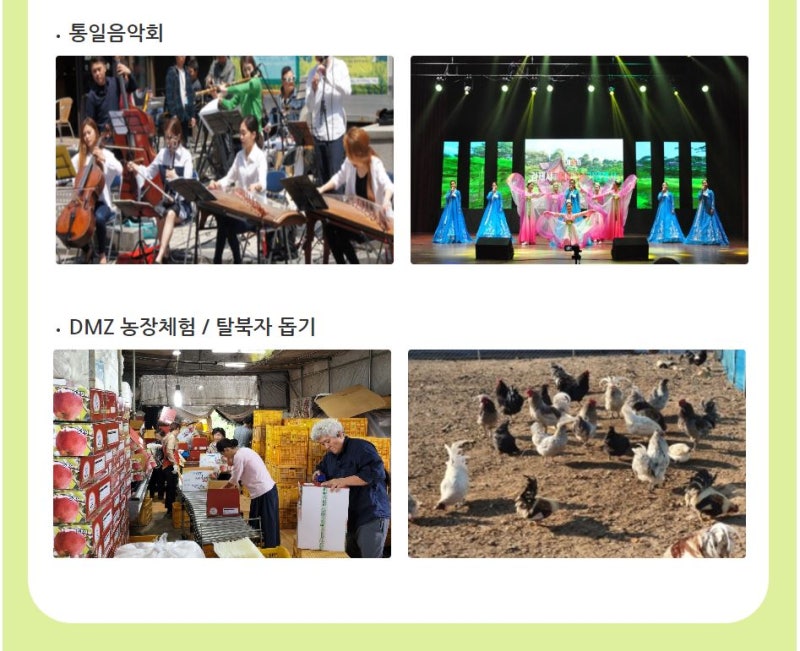 대한민국 경기도 파주 DMZ 견학과 사과 따기 체험도 할 수 있다.사과 따기는 무려 4kg~8kg의 사과까지 받을 수 있다는 것. (우와 체험에 사과까지~~~) #DMZ체험 #사과축제 #파주 #사과따기탈북자 지원 DMZ 농촌지원 DMZ 추억만들기 참여를 통한 나눔 실천과 참가비 이상 혜택 제공 DMZ 평화나눔 통일현장체험1. 참가비 전액(단, 탈북자 지원 기부 참여자)에게 소득 공제 영수증을 발행합니다. 2. 사과의 수확물 4kg~8kg지급합니다. (조건 없이 간직하시도록!^)3. 참가자 명의로 탈북자들에게 선물을 지급합니다. (사과의 수확물 2kg이상)4.DMZ견학 및 사과 따기 체험 5. 통일 음악회 행사 참여(11월 6일 마지막 날에만- 온/오프 라인 참여 가능)6. 참가자에 점심 식사를 제공(음료, 간식은 별도 준비 요망^^)7. 자가용 이용자는 09:50임진강 역 주차장까지 오세요. 공공 교통 기관 이용자는 09:30원산 역 일번 출구(문산 행복 센터 앞)에서 이벤트 차량(버스)에 승차하시면, 안전하게 행사장까지 안내하겠습니다. ^^8. 30명 이상의 단체 신청 시 별도 차량 운영을 지원합니다. 9.DMZ견학 때는 반드시 신분 증명서가 필요합니다. 꼭 가지고 와야 하죠. 신분증을 지참하지 않은 경우는 DMZ체험도 못하고 혼자 밖에 있어야 합니다.(울음)10. 통제 요원 및 안전 규칙 미준수로 발생한 사고는 본인이 모두 책임을 진다. 개인 행동 금지(DMZ민통 선에는 아직 지뢰가 있습니다)탈북자 지원 참가 신청 시 기부를 통한 세액공제 혜택까지 받으시기 바랍니다. ^^(사과기부자명부에 포함됩니다)DMZ 구경도 하고 사과 따기 체험도 하고… 밥도 무료, 교통비 무료, 사과 48kg 무료. 와우~~~DMZ 평화나눔 힐링팜 사과축제는 좋은 일을 하고 DMZ 추억을 만들면서 참가비 이상의 혜택을 직접 느껴보세요.이벤트 참가비는 1인당 600만원?? 하아가 아닙니다. 1인당 60만원?헉! 아니에요. 1인당 6만원!!!앞으로 좀 더 자세한 행사 일정을 한 번 살펴보겠습니다. 9시 문산역 출발, 9시 50분까지는 (개별 출발자 포함) 임진강역 도착으로 일정 시작!오전 사과따기~점심 먹고 오후 DMZ 체험!일정 확인하시고 원하시는 날짜로~선착순 지금 바로 신청해주세요 ^^ 신청 접수는 ↓↓↓↓↓↓↓↓↓↓↓↓↓↓↓↓↓↓↓↓↓↓↓↓↓↓↓↓↓↓↓↓↓↓↓↓↓↓↓↓#DMZ체험학습 #DMZ평화나눔 #파주사과축제 #사과따기체험단, 1인당 10만원의 참가자에 한해. 탈북자 지원 기부에 포함됩니다.이왕이면 6만원의 참가비에 (+4만원)를 더해 기부도 해도 되잖아요! ^^기부를 통한 세액공제까지~~~ 타다 익선!!!DMZ 평화나눔힐링팜 사과축제 참가신청서는 전화로 신청 가능합니다(문의전화 031-944-9736) 참가인원 추가시 50,000원/1명 추가됩니다. 이벤트 당일 신분증 꼭 지참해주세요. 입금자와 소득공제자가 불일치할 경우 소득공제 영수증을 발행할 수 없습니다. 참가비 입금 : (재)한국글로벌피스재단 221-317484-04-027 입금후 문자 남겨주세요 010-2432-9736 참가신청 DB는 추후 행사관련 홍보자료로 사용 가능합니다.forms.gle(이건 꼭 친구랑 놀러갈거야~~~)2022 DMZ 평화나눔 힐링팜 사과축제 참가 신청 접수를 시작합니다.이벤트 : 2022년 10월 22일 ~ 11월 6일 (매일 선착순 접수중)