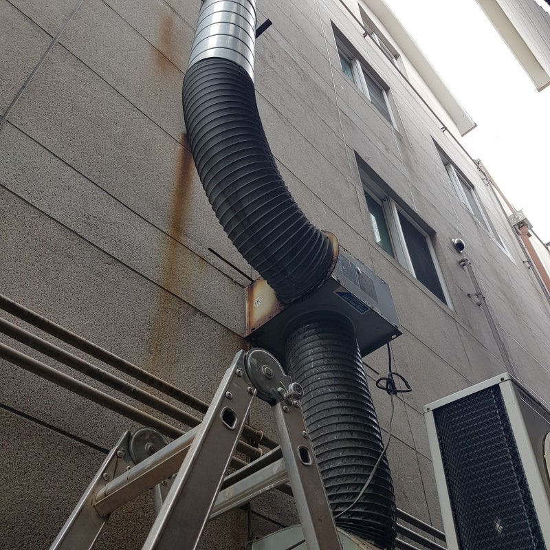 사다리만 2.5m 이상 됩니다. 플렉시블 호스와 소형 주사위 팬을 연결하는 녹이 슬어서 부식된 플렌지 부분을 교체하고 싶다고 하셨습니다.