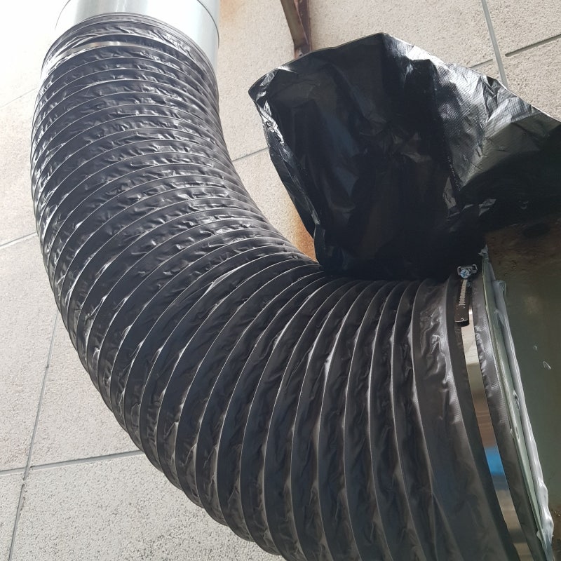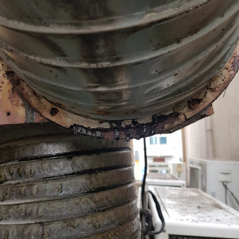 광주광역시 북구 운암동의 한 상가 기름에 오염되어 오일로 가득 찬 자바라(플렉시블호스) 교체 완료하였습니다.고객님께서 매우 담담한 목소리로 신규 오픈 예정 매장으로 부식된 후 렌지와 기름으로 오염된 덕트 호스 교체를 요청하셨습니다.지상 약 3m~4m에 설치된 기름이 뚝뚝 떨어지는 닥트자바라(플렉시블호스)와