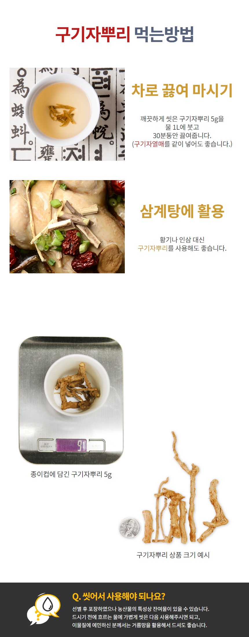 반드시 다른 첨가 재료는 전혀 들어 있지 않은 순수 구기자 원료 100%를 담은 제품으로 선택하는 것이 중요합니다.