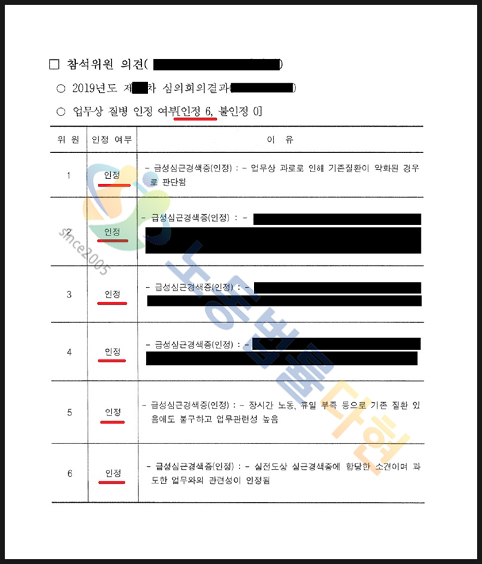 당뇨병과 고혈압은 앞에서 말한 것처럼 심근경색의 직접적인 원인으로 작용할 수 있습니다. 아울러 평소 혈당 관리에 신경 써왔다는 점을 회사 측에서도 알고 있어 쉽게 협조해주지 않은 내용을 확인했습니다. 불승인을 뒤집기 위해서는 이를 반박하는 내용을 치밀하고 명확하게 제시해야 합니다. 또한 이러한 기왕증이 있다고 무조건 인정받지 못하는 것은 아니기 때문에 최근 증가한 38%의 업무 증가량이 증상을 악화시켰다는 부분에 초점을 맞췄습니다. 그 결과 단기 과로 기준에 해당한다는 결과가 도출됐고 유족에게 장례비와 유족연금이 지급될 수 있었습니다.