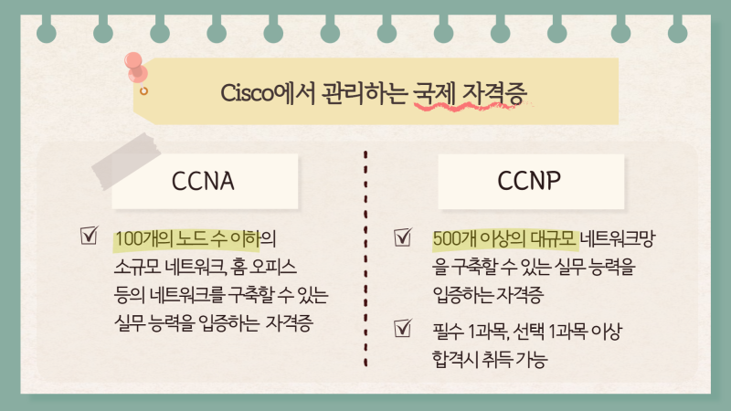 CCNA/CCNPCISCO는 IT 및 네트워킹 부문의 세계적인 선두주자이자 네트워크 기기 회사 중 독보적인 1위라고 할 수 있습니다. 시스코사에서 네트워킹 전문가 양성을 목적으로 시행된 시스코 기술 공인 프로그램 중 하나로 네트워크 설치 및 운영 능력과 네트워킹 지식 습득에 관한 과정으로 거의 모든 기업에서 시스코사 네트워크 장비를 사용하고 있기 때문에 자격증이 있으면 시스코 장비를 다루는 기술 능력을 인정받기 때문에 취업에 유리한 자격증 중 하나입니다.