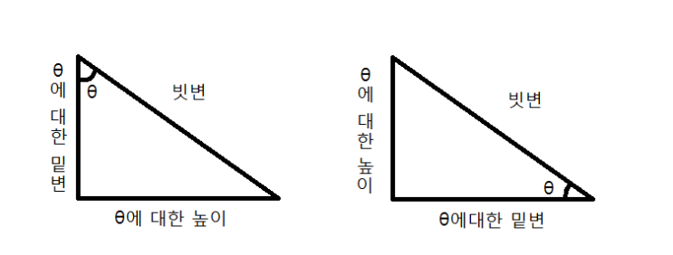 둔각삼각형은요? 예각삼각형은안돼요? 안 돼요. 삼각비랑 나중에 배울지도 모르는 삼각함수는 직각삼각형을 너무 좋아해서요. 우선 정의는 직각삼각형이라고 가정하기 때문이죠.