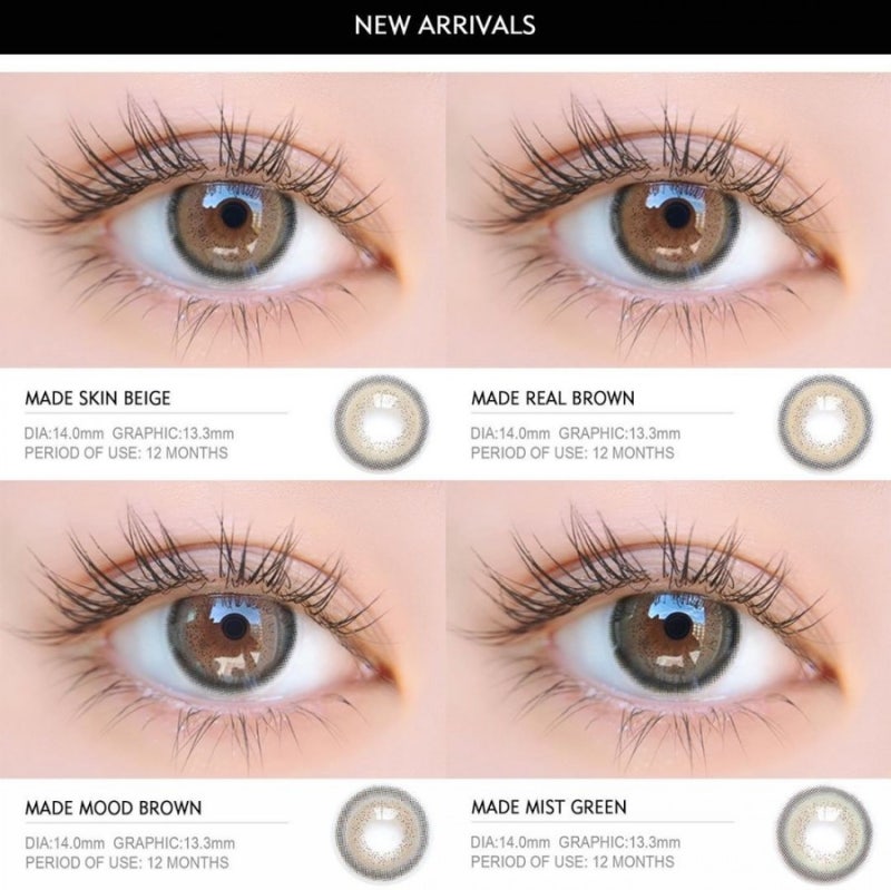 아이돌 렌즈 메이드 직경 13.3mm 컬러 스킨 베이지, 리얼 브라운, 무드 브라운, 미스트 그린 도수 범위 0~-10.00D