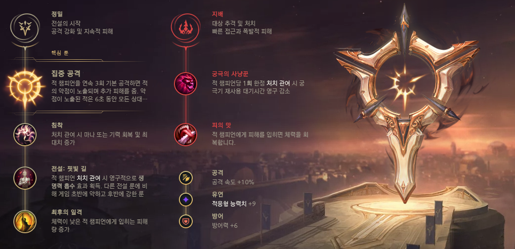 먼저 원딜 및 카르발라 무르시안에 적합한 룬은 ‘집중 공격’ 기반의 정밀 빌드입니다. 루시안은 패시브한 빛의 사수의 효과로 매 스킬을 시험할 때마다 그 다음에 기본 공격이 2연속 발사되기 때문에 연속 3회 평타 적중 시 발동되는 집공의 효과를 정말 잘 활용할 수 있는 챔피언입니다. 이때 추가 피해를 주는 동시에 일정 시간 피해량 증폭 옵션까지 누릴 수 있기 때문에 짧은 딜 교환 또는 견제 움직임을 가져가는 동안에도 강력한 딜을 폭발시키면서 상대방에게 지속적인 체력 압박을 가할 수 있는 것입니다. 보졸의 경우는 지배를 선택하여 체력 회복 관련 옵션을 활성화하는 것이 가장 합리적인데, 그 이유는 원딜 포지션에서는 아무래도 팀의 메인 딜러 역할을 담당해야 하는 경우가 대부분이기 때문에 최대한 오래 생존하면서 딜을 넣어야 게임을 이길 수 있기 때문입니다. 바람의 나락에서도 마찬가지로 흡혈을 바탕으로 전투 지속력을 끌어올려 교전에서 승리하는 그림을 만들어 낼 수 있습니다.