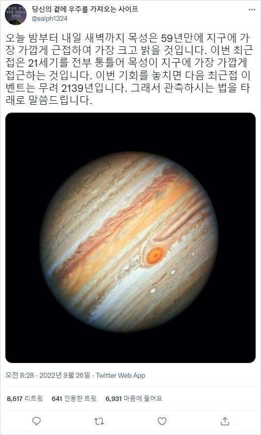 이번 기회는 쌍안경이나 작은 망원경만으로도 목성 고리와 갈릴레이 위성 3~4개를 관찰할 수 있는 최고의 관측 기회로 높은 산속, 어둡고 건조한 곳이 최적지라고 합니다.