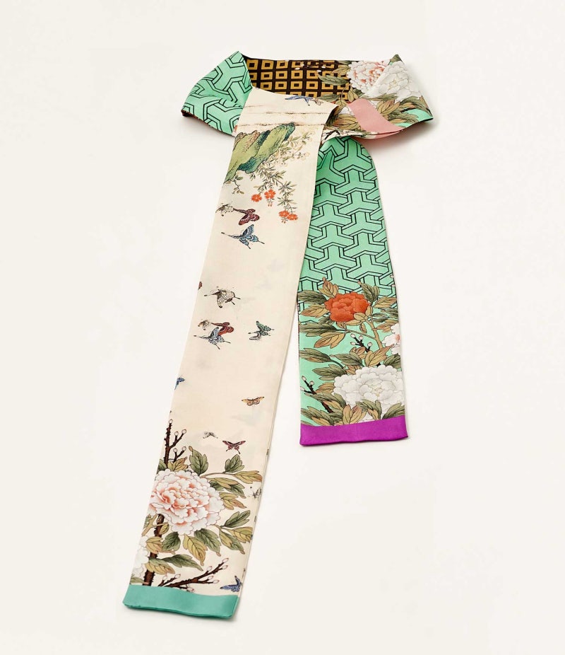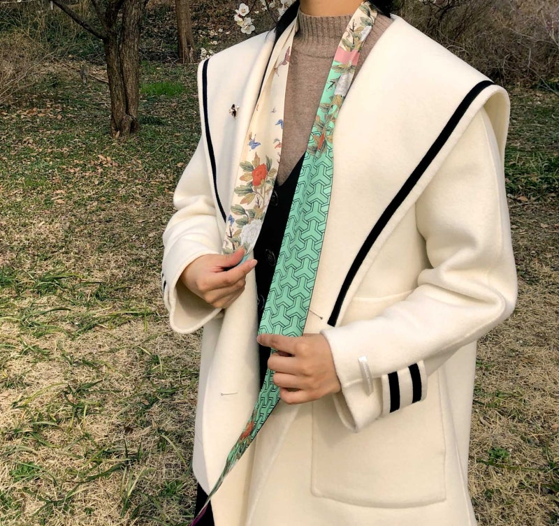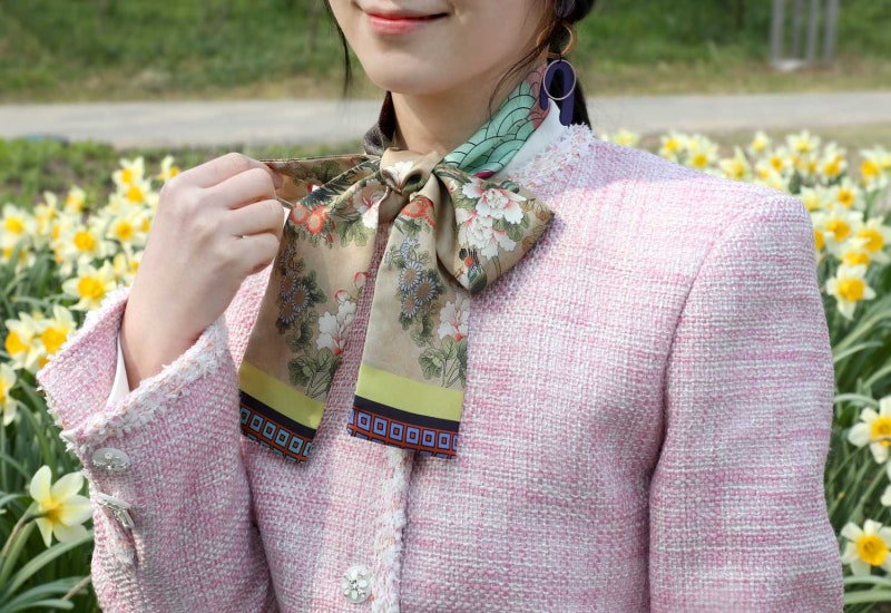 이렇게 목에 쓱 감고 리본도 달아 한번 감거나 여러 가지로 자신의 스타일에 맞게 감을 수 있는 트위리스 카프! 국립중앙박물관 굿즈, 뮤즈의 예쁜 트위리스 카프 ‘부귀영화’의 선명한 색감에 포인트로 너무 예쁘다.깔끔하게 목에 거는 방법도 있지만 더운 낮에 스카프를 풀고 잃어버리기 쉬우므로 이럴 때 손목이나 가방에 감으면 보관은 물론 멋까지 낼 수 있는 실용적인 방법!손목이나 허리에 감은 목에서 스카프를 풀어 가장 쉽게 묶을 수 있는 손목과 허리에 감아본다. 트위리스 커프는 원하는 폭에 맞춰 접거나 그대로 감아 리본 매듭이 손목 바깥쪽으로 보이도록 묶으면 발랄한 느낌을 낸다.슬랙스나 벨트 고리가 있는 스커트를 입었다면 스카프를 벨트처럼 활용해 보는 것도 좋다.