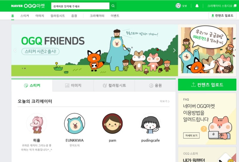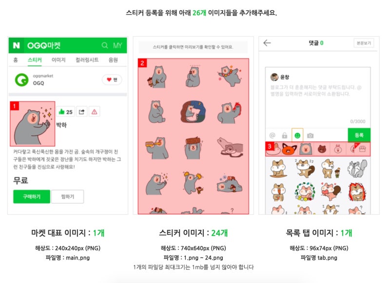 위 캐릭터 스티커 이미지 24개를 제작하여 OGQ 크리에이터 스튜디오에서 업로드하였습니다.스티커를 업로드하는 방법은