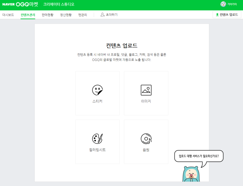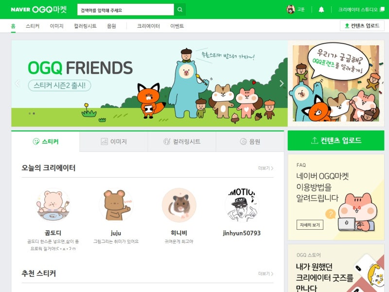 위 캐릭터 스티커 이미지 24개를 제작하여 OGQ 크리에이터 스튜디오에서 업로드하였습니다.스티커를 업로드하는 방법은