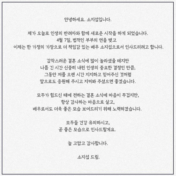 2020년 4월 7일 조은정과 혼인신고를 하여 법적으로 부부가 되었습니다. 코로나19로 인한 시국을 반영해 결혼식은 올리지 않고 대신 5,000만원을 굿네이버스에 기부하는 것을 대신했습니다. 현재 동상이몽 2-너는 내 운명 시청자 게시판에는 소지섭-조은정 부부를 섭외해달라는 시청자들의 요청이 쇄도하고 있습니다. 이번에 새로 들어온 드라마 닥터 로이어 기대하겠습니다.