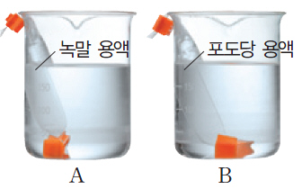 셀로판지를 이용하여 복주머니 모양으로 만들고 포도당 용액과 전분 용액을 넣고 실로 묶은 후 막대에 매달아 증류수 가든 비커 안에 넣어 둡니다.