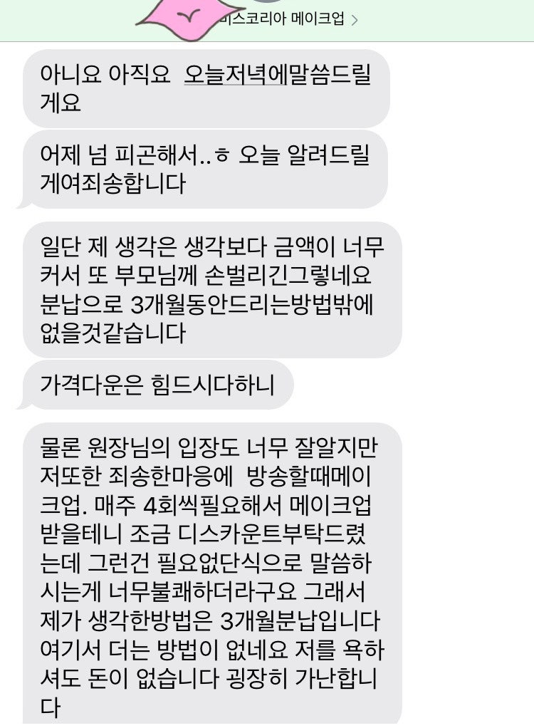 문자 내용을 보면 상대방은 동의하지 않음에도 불구하고 3개월 분납으로 처리하는 등 돈이 없어 매우 가난하다고 말하기도 합니다.