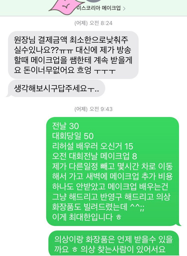 A씨는 8월 21일 아나운서로부터 처음 연락을 받고 미스코리아 대회를 위한 출장 메이크업을 해줄 수 있느냐는 문의를 받았다고 합니다.당시 A씨는 제주도에서 비행기를 타고 가야 했기 때문에 출장비가 많이 든다고 미지의 공지를 했고, 서효경 아나운서는 약속 시간도 제대로 지키지 않았고 일정 변경도 자주 했다고 합니다.A 씨는 자신은 프리랜서이기 때문에 시간은 금방 돈이라며 예약받은 시간에 다른 일을 잡을 수 없기 때문에 당일 변경은 큰 피해를 준다며 그래도 일단 맡은 고객이라 아나운서를 매너 있게 대했고 대회의상 4벌도 무료 대여했다고 말한 것으로 알려졌다. 하지만 대회에서 탈락한 서 아나운서가 기분이 상했다며 A씨의 연락을 피하기 시작했다고 합니다.