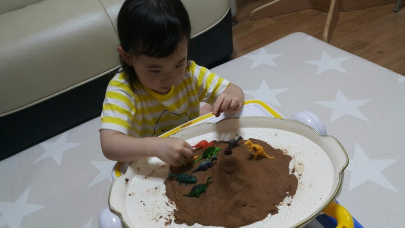 물약통이나 스포이트도 많이 썼는데 작고 물 보충을 계속해야 해서 조금 번거롭다고 한다. 마침 부드러운 큰 소스통이 집에 있었기 때문에 지누는 마음껏 물을 짜면서 마그마가 넘치는 모습을 잘 관찰할 수 있었다.원래 갯벌에서 조개를 캐는데 이런 소스통에 소금물을 넣고 짜면 조개가 나온다고 해서 사놓고 결국 못 썼는데 이렇게 활용한다.
