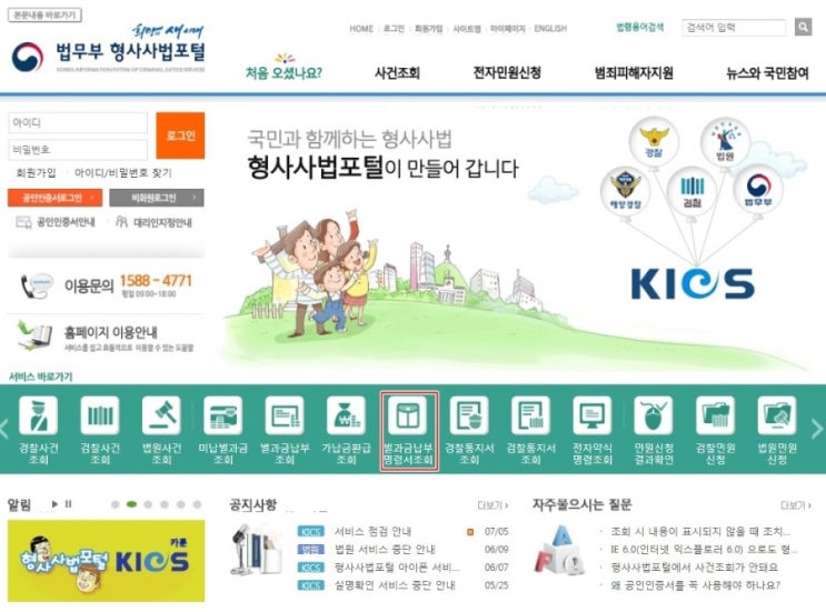 나의 사건, 사건 진행 정보, 온라인 민원 처리 및 안내, 벌금 납부 조회 등 각종 형사사법 정보를 신속하고 정확하게 제공하는 대국민 서비스 포털입니다.www.kics.go.kr