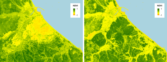 식생지수 값이 -1에 가까우면 물에 해당하고 0에 가까운 값(-0.1~0.1)은 바위나 모래처럼 건조한 지역, 1에 가까운 곳은 온대 및 열대우림, 낮은 양수값(약 0.2~0.4)은 관목과 초원을 나타냅니다.