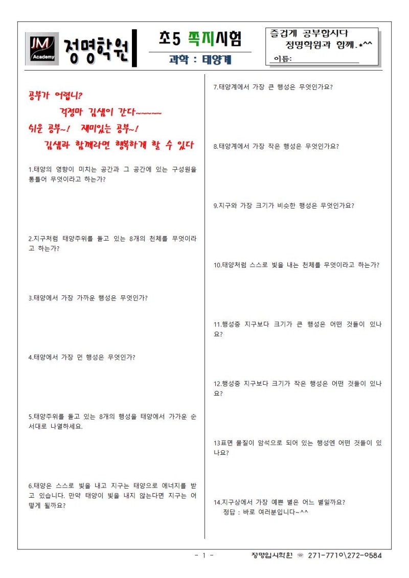인성초등학교 5학년 실반 전교예배 / 과학-태양계 행성의 거리 / 국어-수일과 수영 이야기의 뒷이야기를 상상하고 쓰다