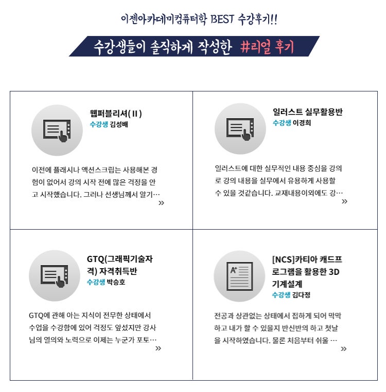 기초적인 기술 활용부터 응용 과정, 직접적으로 설계를 해보는 부분까지 훈련 과정이 제대로 된 것 같은 느낌을 많이 받았습니다. 최종적으로 이곳을 통해서 자격증 국비지원 과정을 공부해야겠다고 결심한 결정적인 이유가 바로 그 부분이라고 할 수 있습니다.만약 내가 어떤 것을 공부해야 할지 아직 결정하지 않은 상황에서도 여기서 충분한 면담을 통해 결정할 수 있게 되어 있으니 걱정하지 않아도 되었습니다. 인적성 및 구체적으로 계획을 해주셔서 제가 흥미와 원하는 것을 바탕으로 얼마든지 저에게 맞는 분야를 찾을 수 있었습니다.