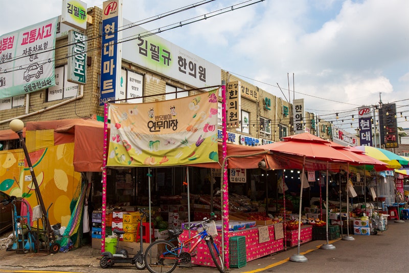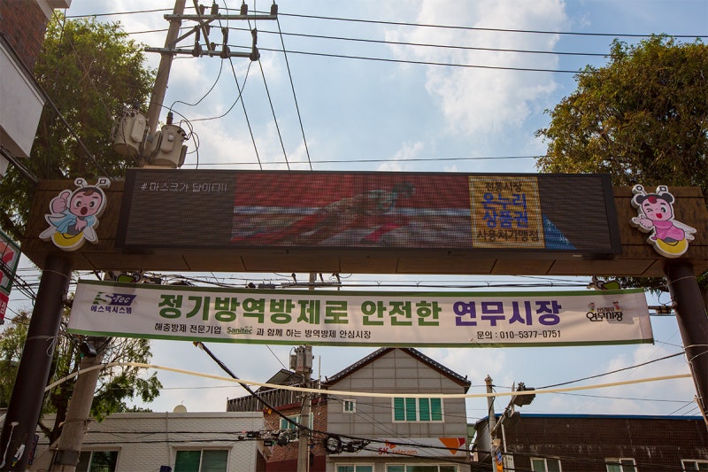 수원의 전통시장 중 연무시장은 갤러리 시장으로 3구역을 간판, 전주, 상인 초상화로 구분하였습니다. 전통시장 거리 간판 위는 녹색, 전신주 녹색, 상인 초상화는 노란색 바탕입니다. 매장 사장님 얼굴을 그린 상인 초상화로 가게의 특징을 알리고 신뢰도를 높였습니다.
