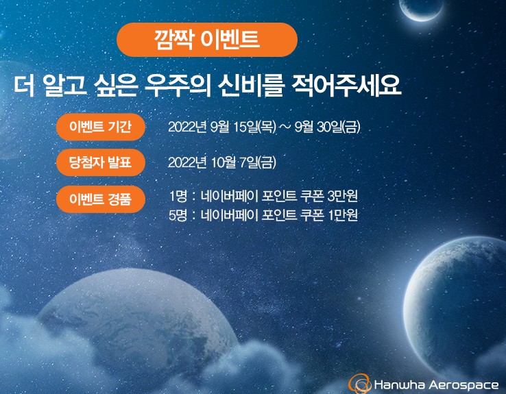 행사일정 행사기간 : 2022.09.15(목)~2022.09.30(금) 당첨자 발표 : 2022.10.07(금) 한화에어로스페이스 공식블로그