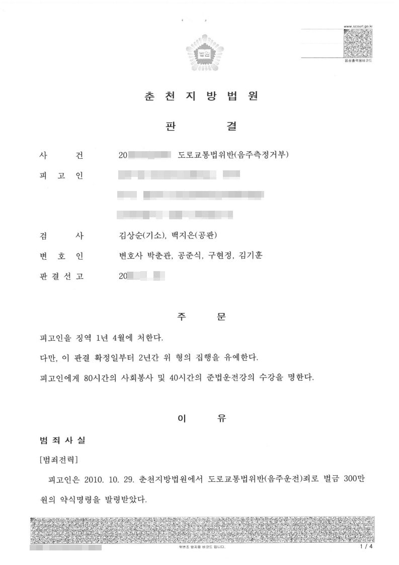또 법관의 개인적 능력에 기반을 두는 행위, 즉 양형 요소는 법관의 재량에 따라 형이 결정될 수 있으며 소송 주체의 능력은 무엇보다 중요하다고 생각되기 때문에 비법인 혼자 진행하는 것보다는 효율적인 진행을 위해 춘천 변호사의 조력을 받는 것이 유리하다고 했습니다. 다행히 C씨는 초기에 적극적으로 대응한 결과 만족스러운 결과를 이끌어낼 수 있었고 일상생활에 무사히 복귀할 수 있었다고 말했습니다. 본 사건의 경우 호흡, 혈액측정 결과가 명확한 범죄행위이므로 무조건 혐의를 부인하거나 반성의 태도로만 일관할 경우 오히려 가중처벌을 받을 수 있으며 양형기준표를 참작하여 최종 양형에 긍정적인 처벌이 이루어질 수 있도록 대응할 필요가 있다고 하였습니다.