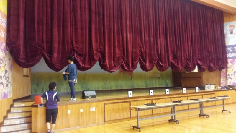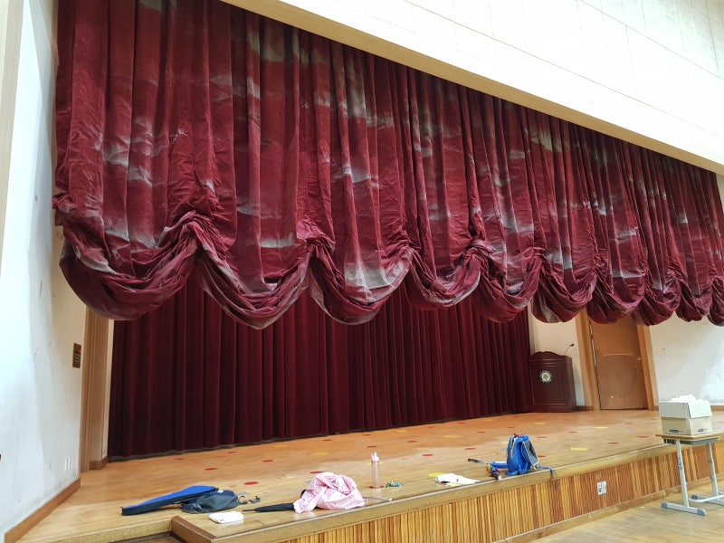 답사 후 학교 담당자 분과 충분한 논의로 작업을 진행해야 합니다.학교 강당은 높고 면적이 크기 때문에 청소 경험이 많은 업체를 선정하는게 중요해!!평소처럼 커튼을 먼저 치고 세탁할 준비를 해야 합니다.