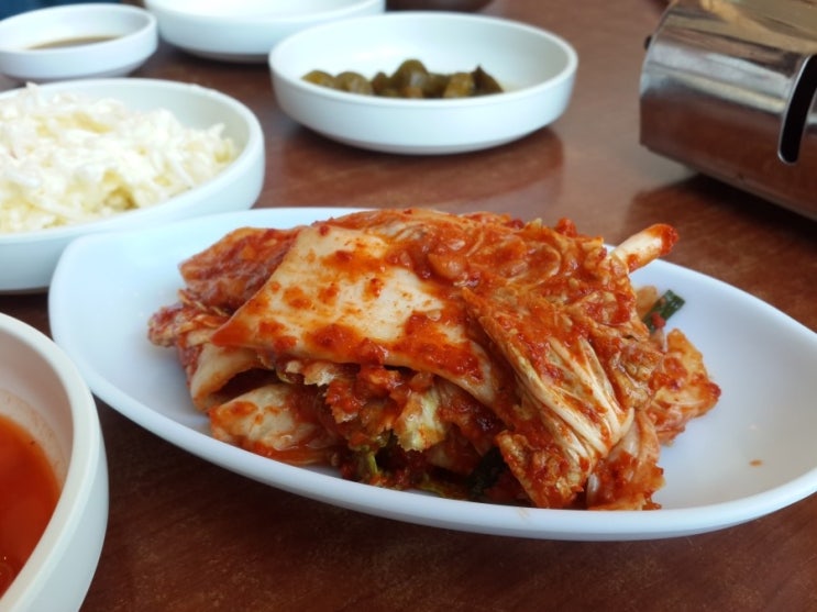 기본 반찬은 김치, 깍두기, 고추장아찌, 천사채 샐러드.반찬은 하나같이 다 맛있었고 특히 김치 맛있었습니다.
