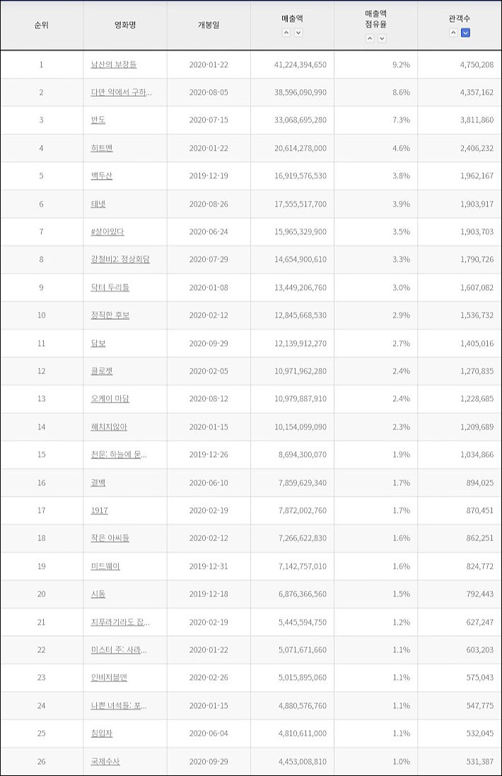 그 기념으로 2020년 영화 흥행 순위를 정리해봤다. 이번엔 한국영화만!