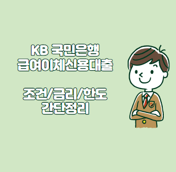 KB국민 은행 신용 대출-KB급여 이체 금리 조건 KB국민 은행은 국민 은행으로 급여 이체에 고객을 대상으로 추가 우대 금리를 제공하는 신용 대출 상품을 운용하고 있습니다. 최고 1만 억 5천만원까지 빌릴 수 있으며 금리는 최저 5.89%~최고 7.31%로 낮은 편입니다. 현재 국민 은행 계좌로 급여를 받는 사람이면 이 상품에 주목하고 보세요.KB국민 은행 KB급여 이체 신용 대출은?KB국민 은행의 고객 속에서 국민 은행 계좌에 급여 이체 중들을 대상으로 만들어진 금융 상품입니다. 최대 1억 5천만원까지 빌릴 수 있으며 국민 은행 계좌에 급여 이체 중 쪽에는 추가 우대 금리를 제공합니다.금리는 최저 연 5.89%에서 최고 연 7.31%로 제1금융권 상품처럼 작습니다. 기간은 상환 방식에 의해서 다르게 적용되어 만기 일시 상환 방식은 1년 원금 균등 상환, 원리금 균등 분할 상환 방식은 1년부터 10년 이내에서 선택이 가능합니다.KB국민 은행 KB급여 이체 신용 대출 금리와 한도는?금리 이 상품의 금리는 2022년 8월 31일 기준으로 적어도 연 5.89%에서 최고 연 7.11%이며, 신청하실 분의 거래 조건과 신용 상황마다 다르게 적용됩니다. 또 이 상품은 금리 인하 요구권을 사용할 수 있습니다. 그리고 5천만원 이상 빌린 경우는 인지세가 발생합니다.