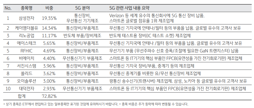 No. 종목명 비중 1 삼성전자 19.0% 2 리노공업 15.1% 3KMW 7.1% 4 한미 반도체 5.8% 5비에이치 5.4% 6 서진시스템 4.2% 7RFHIC 4.2% 8파트론 3.7% 9 ISC 3.2% 10 솔리드 3.1%