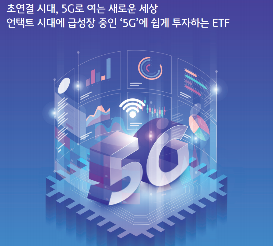 KBSTARFn 5G테크 ETF(티커:367760, 출처:KBSTARETF) KBSTARFn 5G테크 ETF는 4차 산업혁명의 핵심 인프라인 5세대 이동통신(5G) 밸류체인 전반에 투자하는 ETF입니다. 5G관련 통신장비, 기지국장비, 가입자망장비 등 5G산업에 포함된 기업을 구성종목에 포함하고 있습니다.